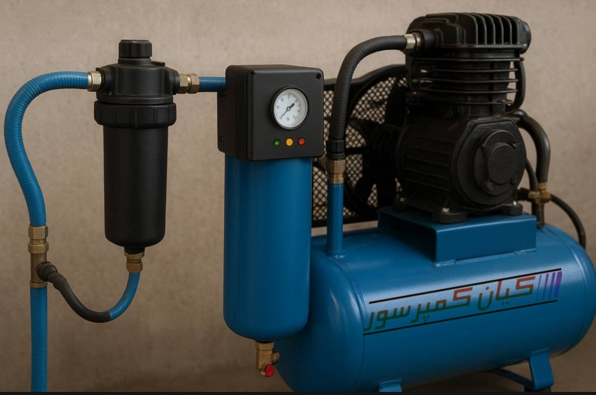 به همین دلیل استفاده از تجهیزات جانبی مثل درایر (خشککن هوا)، تله آبگیر (واتر سپراتور) و میکروفیلتر ضروری است. این تجهیزات مکمل کمپرسور بوده و تضمین میکنند که هوای خروجی کاملاً خشک، تمیز و بدون آلودگی باشد.